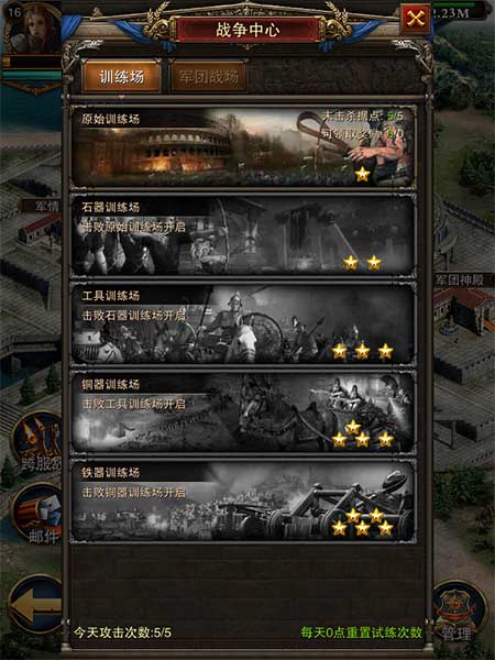 军团副本和军团争霸的进入点,军团副本有原始训练场、石器训练场、工具锌炼厂、铜器寻训练场、铁器训练场。打通训练场后可以领取奖励并开启下一训练场,每日重置;军团争霸玩法有百团混战、军团争霸、跨服百团混战。