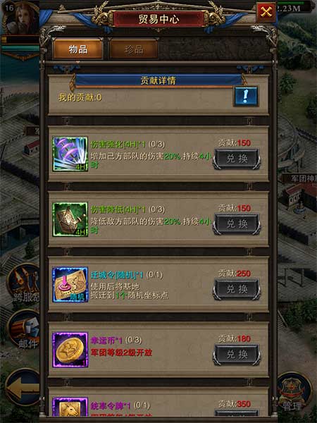 军团成员可以使用个人贡献在此兑换道具,普通物品种类固定,每日0点重置购买次数,珍品每天的0点、12点、18点刷新物品。