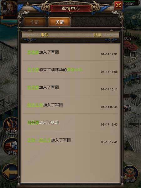 可以查看军情和民情信息,在这里玩家可以了解成员正在进行的战争,包括本军团成员发起的进攻或遭到入侵的防御。以及成员加入或者脱离联盟,军团升级都会在这里显示。