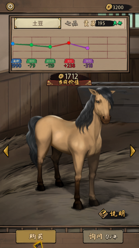 1、在本站下载中文最新版的游戏打开进入开始游戏,新手一进入游戏就会有3200的金币可免费使用,可直接选一匹性价比高,速度快的马,这里我直接看中了名叫土豆的马。