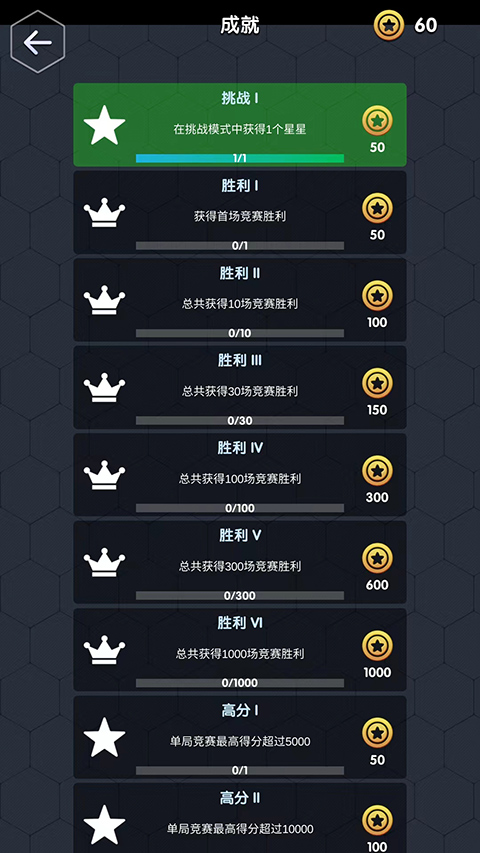 10、进入【成就界面】,可看到挑战、胜利和高分等成就目标和领取奖励,