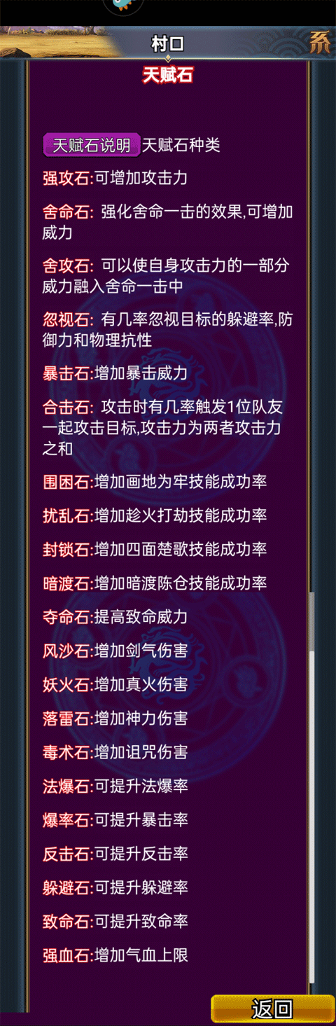 3、每场体力值战斗,天赋石元气+1,吸收同种天赋石可增加大部分元气,吸收不同种天赋石可增加部分元气