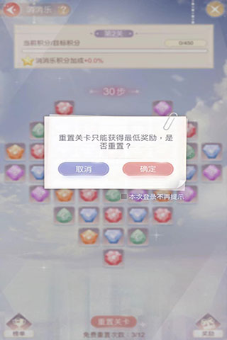 4、玩家可以重置消消乐关卡,但重置后只能获取最低奖励;