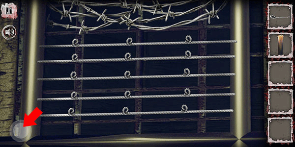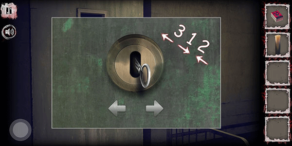 6、之后再次返回室内,接下来我们点击左侧的铁门,并且使用刚刚获取的钢丝来开锁,开锁顺序按照我们刚刚看到的小人操向的方向也就是左右左并且次数分别是3、1、2即可撬开门锁