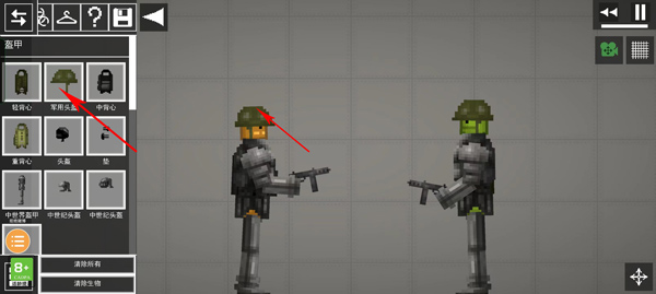 2、然后给两个生物人分别都装备上武器和盔甲,点击盔甲拖动到生物人身上就可以穿上盔甲了;