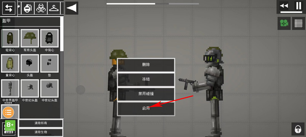 3、之后,双击生物人的手臂点击启用,就可以握住武器了;
