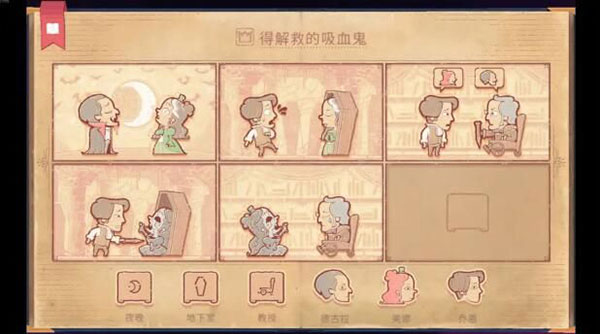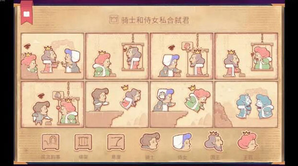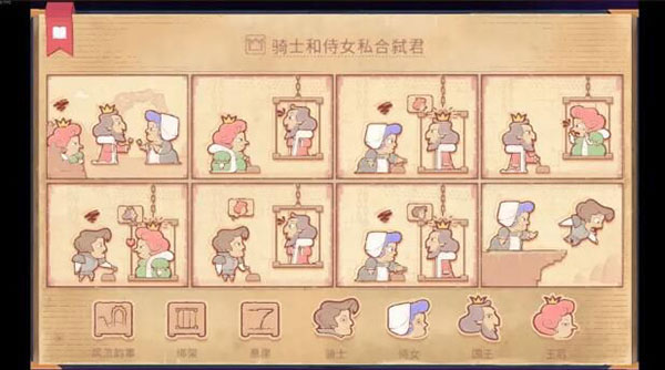 1、游戏本身的美术呈现就像是一本童话故事,依照标题的叙述,玩家可以自由利用下方的人物及场景素材搭建一则故事,只要符合标题即可通关。
