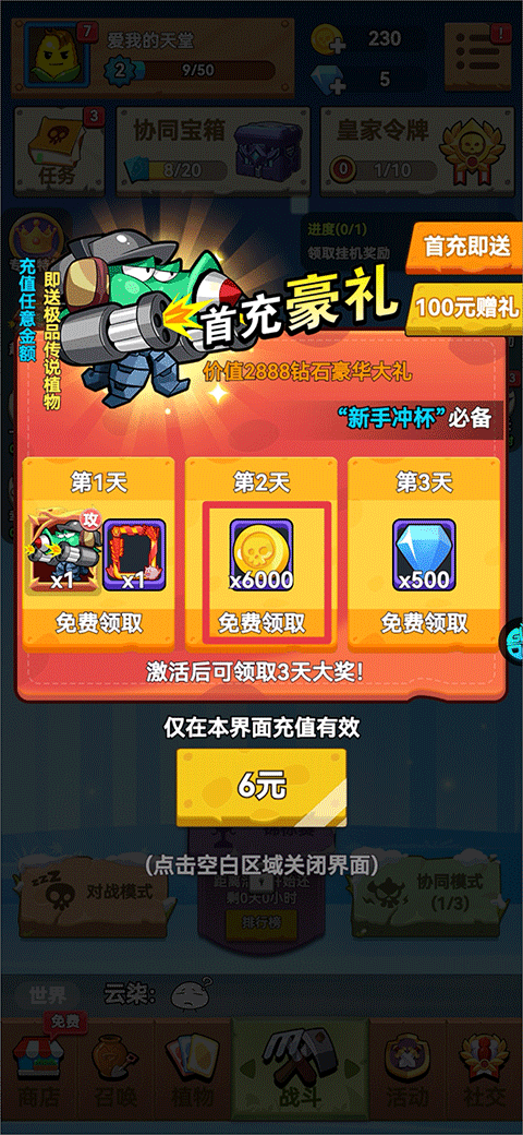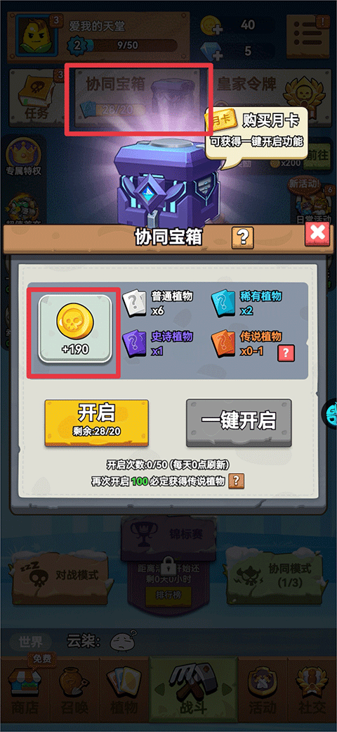 2、协同宝箱:开启协同宝箱后不仅可以获得植物英雄,还会有金币