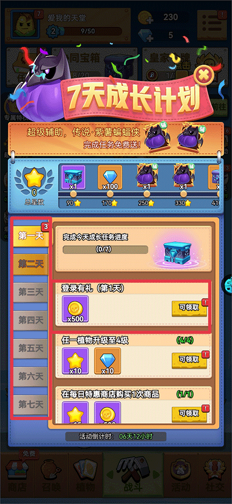 3、7天成长计划:每天登录游戏并完成签到后,即可获得金币