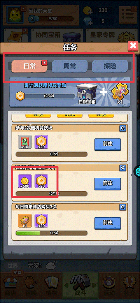 1、任务:完成日常任务、周常任务、探险任务后可以获得金币奖励