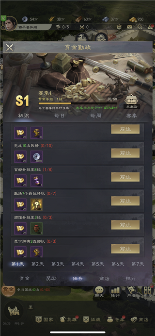 赏金任务分为:初识、每日、每周、赛季任务,以及未来的密旨任务,每日任务可获得活跃度,活跃度达到一定值,可以获得活跃奖励,其中政绩奖励非常重要,可解锁更多功能开启。