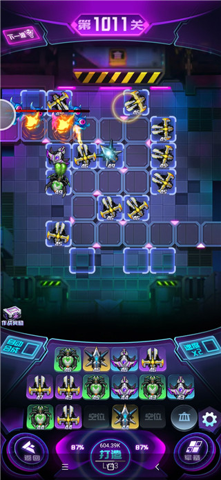 3、整体的设计就是常规的塔防模式,玩家通过放置炮台的形式抵御敌人的进攻,不过有趣的是游戏的机制设计还是比较巧妙的,因为加入了Roguelite的元素,所有游戏中也有一些合成玩法,玩家可以通过合成的机制获得更强势的炮台,初次之外还有较为完整的养成体系,比如炮台升级、抽卡体系等等。
