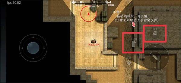 4、手雷:拖动然后松开可丢雷(注意:丢到墙壁上手雷会反弹)