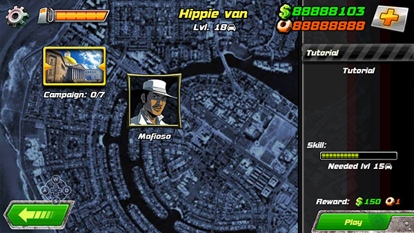 为了方便玩家进行180度的漂移,游戏采用了按键遥控的操作方式,画面左侧为方向按键和技能按钮,右侧则是油门、刹车以及攻击性武器按键,由于游戏需要不停的倒车漂移玩家进行游戏时可能会有点不大适应。不过熟悉之后还是蛮爽快的。速度起来后一脚刹车甩尾,车辆180度大转弯,方便攻击到身后的敌人,操作感特别爽快。虽然游戏标榜是竞技游戏,但其实并不像其他游戏那样通过挑选地图进行比拼,关卡地图模式的设定,要求玩家通过关卡解锁从而开启新的地图。游戏共分为三种模式,战役地图、常规地图还有最终BOSS战,进入战役地图和BOSS地图需要一定的改装值,这就需要玩家不断的挑战常规地图攒钱进行改装。玩家可以在装甲和武器上进行强化,强化后的车辆才能加入更为激烈的战场,挑战更为强大的车辆。