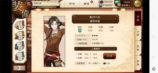 点击装备,可进入装备界面,完成查看已有衣装、衣装升级、查看文豪等级、文豪开花、装像升级与分解以及指环升级的工作。