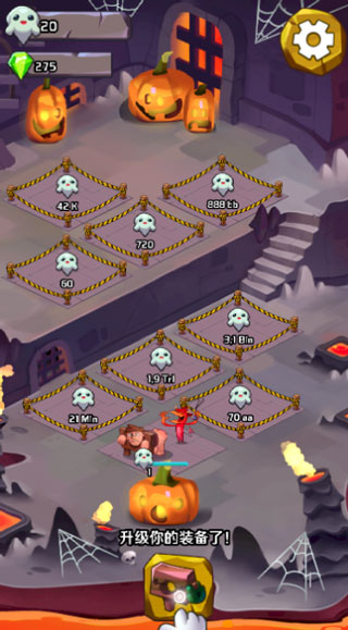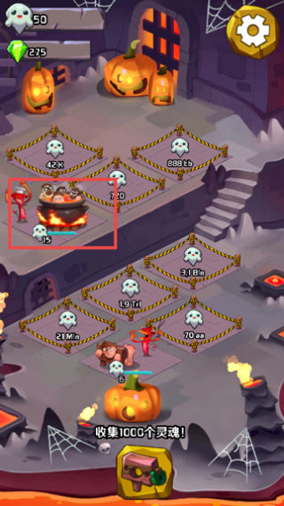 这是一款以地狱为主的放置类游戏,游戏界面卡通可爱,点击空地,开始建造并装备空间。滑动屏幕收集灵魂,一开始先收集20个灵魂。