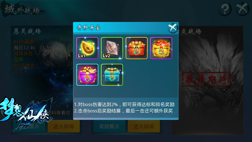 恶灵战场BOSS是恶灵骷髅。魔蛇战场BOSS是蛇蝎女王。两个战场的BOSS刷新都在每天的12:40和21:30,每个战场独立。战场内还有小怪和精英可以挑战,获得最后一击的玩家可以收获丰厚的奖励。