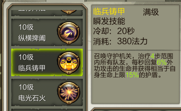 技能原理:提供护盾和治疗;技能本身不算强大,搭配10层天赋才变得完整——提升自身和队友15%暴伤减免或韧性,极大地增加了团队生存能力。