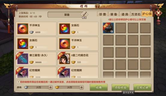 寄售:售系统是游戏中唯一可以交易的平台,不能私下交易,不管玩家是卖装备,还是买装备,亦或者是转元宝,出售元宝,都必须通过寄售,寄售的物品可以是武器、防具、饰品、材料、药品五大类。