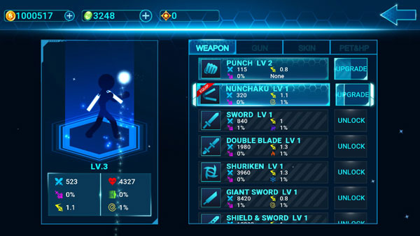 点击进入升级界面,就看到这幅模样...是不是觉得武器类型角色装备都非常之多,但是多归多,都需要绿宝石才能购买!一般获得绿宝石有两种方法:一是通关获得绿宝石,二是充值购买,三是购买角色获得绿宝石,后两种都需要充值。前者需要玩家自己的平时的积攒。对于平民玩家的我们来说,要么就努力攒绿宝石,要么就下载破解版。两种二选一即可,武器也就是前面说的近战类武器,枪就不需要我多说什么了吧。连衣裙,。听起来是不是很别扭?其实连衣裙是角色皮肤,有些皮肤列如:SPARTACUS。这款皮肤在血量上就增加到80000之多,对于后期而已。挑战大boss岂不是轻而易举呢?