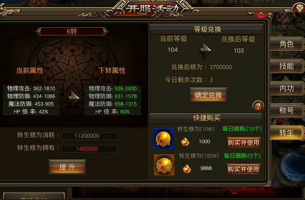 3、开服期间,有条件的玩家也可以进行经验炼制,进行快速升级!