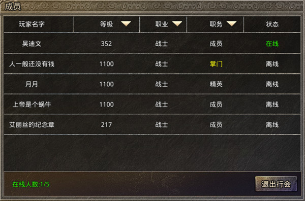 我们在成员界面查看会里的兄弟,最上面一排可以进行筛选,帮助各位了解会里的职业分布,以及等级情况,最有意思的功能就是会长可以通过编辑封号,编辑职务的称谓。