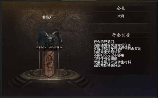 最直观的显示,我们可以看到目前行会名字、会长和公告信息,在这个页面,会长可以进行行会公告的编辑。