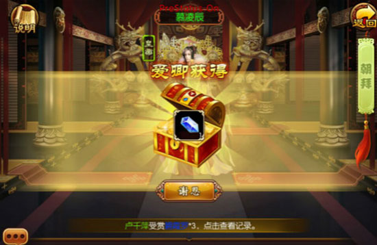 每天最有机会见到皇上的时候,就是朝拜的时候,每次朝拜可以获得主上的赏赐。赏赐可能会有珍宝,元宝赏赐有更高的机会获得珍品。一旦玩家受赏,奖励将重新刷新,有需要的小主一定要好好把握机会,每一次都可能是你成为凤凰的机会。皇帝、皇后可以领取贡品,每天朝拜出现的珍品越多,皇帝、女皇收到的贡品也就越多。皇帝、女皇每天有权更换一次珍品。