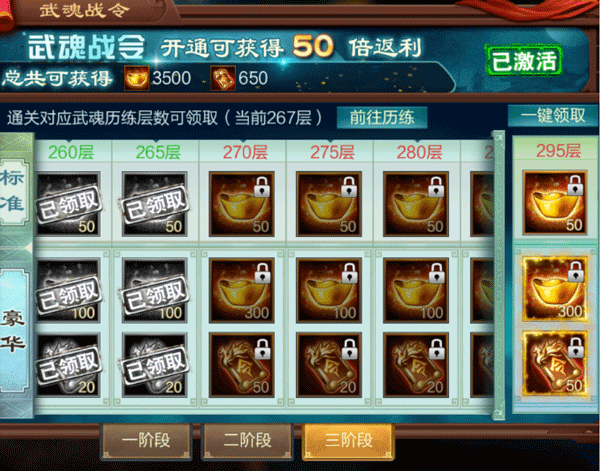 培养神兵的主要途径。所有的加成都是全体武将,精英挑战每天都买满次数。不要购买额外挑战次数,每天2-3次绝对够打的。尽量在战力大幅提升过后来打一次。配套的“武魂战令”,强烈建议购买豪华版