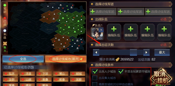 小技巧:军府栏里面的,方块城池是县城(200城防部队)。圆圈城池是关隘(100城防部队)。高战可以只选方块挂机,更效率