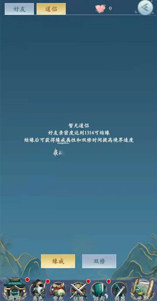 结道侣是永恒修仙手游内一个非常有趣的玩法,很多玩家对于结道侣都是非常的好奇,那么今天小编就给各位玩家带来了永恒修仙结道侣方法,感兴趣的小伙伴可以一起来看看。结道侣不但可以增加好友之间的亲密度,在成功结成道侣之后,还可获得元气属性以及双修时间提高境界的速度。因此,对于大多数玩家来说,在游戏内结道侣是非常有必要的,因为它能在一定程度上提高角色的战力。