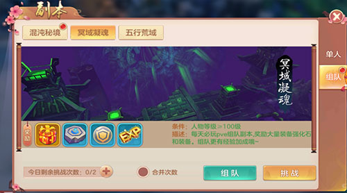 当等级达到100后可以选择先通关一次“冥域凝魂”,组不到人也不用怕打不过,因为当人数不满三人的时候是会派出助战英灵NPC来帮忙通过副本的喔,是不是很贴心呢。(ps:在副本时千万别忘了使用多倍经验丹喔,如果身上没有的话可以选则在商城使用绑元获得)