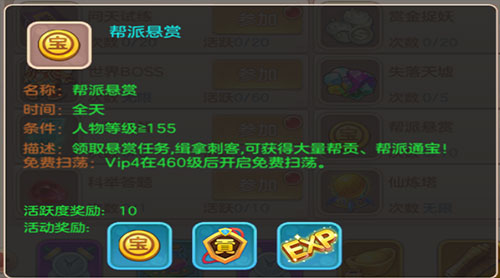 其中帮派悬赏则为每日日常任务,每天可完成10次每日刷新次数。奖励则为大量经验。