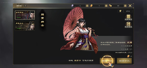 3、所以游戏最核心的内容还是在于招募各种武将,也就是大家常说的抽卡。招募强力武将需要消耗招贤令,能够通过元宝购买,目前在新服中也会赠送大家很多福利,其中就有大量招贤令。所以在前期小编不推荐大家将宝贵的元宝花费到这里,用系统赠送的就已经足够。集合起一套阵容后,还要对武将进行培养,优先选择12资质的红色武将,无论从成长还是技能,效果都要远超其他低品级角色。