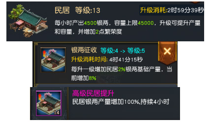 首先是升级建筑,通过升级官府来解锁更多的民居,通过升级民居来加快银两的产出速度,等民居等级高到一定程度后,哪怕什么都不做也可以收获大量银两。同时升级科技里的银两征收,以及使用道具民居提升可以进一步提升民居的效果。