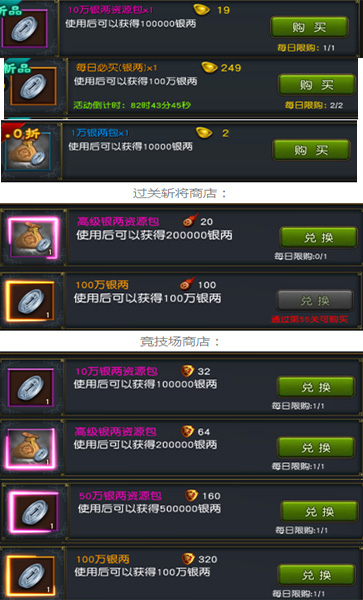 通过横扫挑战里面的战役可以非常有效率的获取银两,而过关斩将中每过五关得到的宝箱中更是可以开出大量银两,并且过关斩将也可以使用横扫,还不用损兵。如果这些方法用完后还是缺银两的话,我们可以在商店里利用元宝等货币来购买银两。商店: 过关斩将商店: 竞技场商店: 开启军功宝箱也可以获得大量银两。