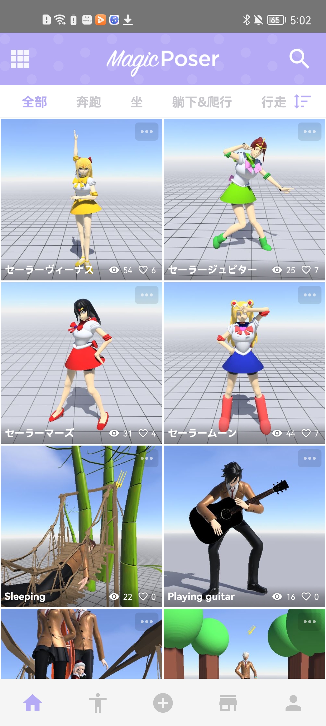 1、进入魔法人型师游戏中,在首页界面,可以看见全部的人物动作图片,比如奔跑、坐、躺下和爬行等