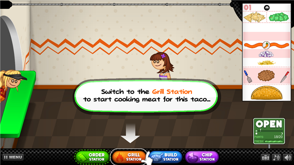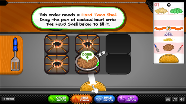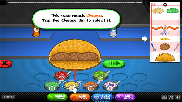 在本作中,每个顾客订单都是一个动手的过程,玩家必须轻松制作各种不同口味的塔可订单,首先玩家需要加入肉锅放到火炉进行烹饪,并继续检查每个锅翻转的正确的时间,当肉丁烹饪完成后倒入卷饼中,然后根据订单口味的需求加入各种配菜,最后在来一碗脆片和新鲜沙拉就能够出餐啦。