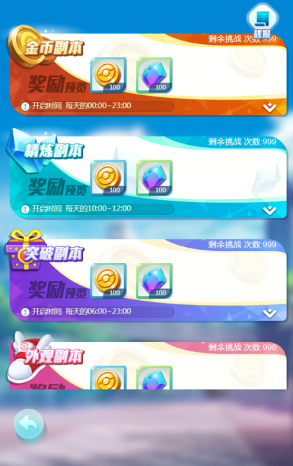 玩家每天都有一定的挑战次数,通过挑战不同日常副本可以获得大量的对应资源,通过副本的难度要求,可以开启更高难度,获取更多资源奖励。