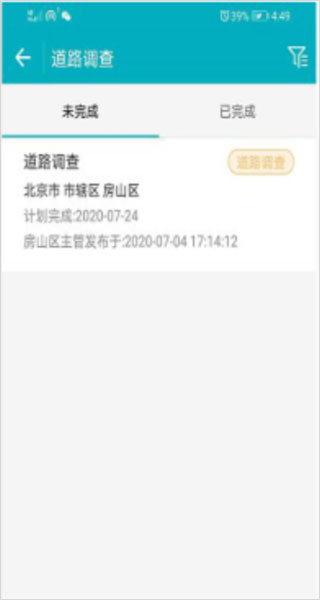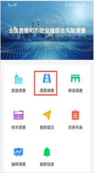1、打开房屋市政普查系统软件后,重点对内业调查的成果进行现场核对,以及对沿线的附属设施进行调查调査员登录移动端系统,点击【道路调查】,点击目标任务进入到地图界面;