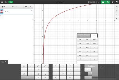 我们的 Desmos 科学计算器的主键盘显示数字键盘、基本操作和基本三角函数、根、分数、指数和绝对值的功能。