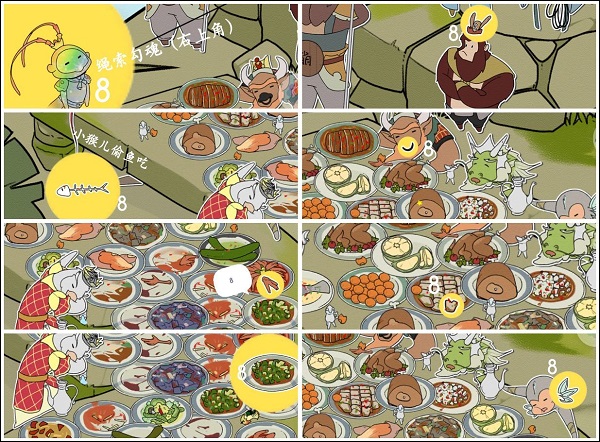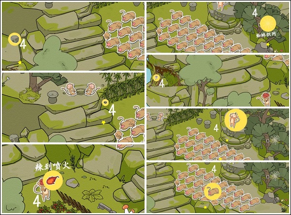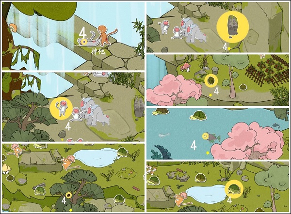 在每一个关卡都设计了3个左右的更具挑战性的终极目标,这些目标是需要观察场景中的角色和物品等之间的关联性,通过一些操作来让这些角色互动,从而找到目标。这些终极目标是无法在游戏中使用提示找到的。
