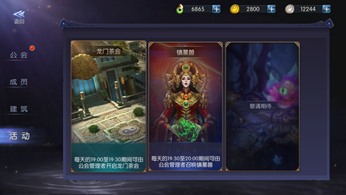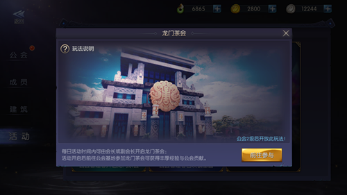 每天的19:00~19:30,公会会自动开启龙门茶会。玩家在茶会期间回到公会领地,每一个参加茶会的公会成员都会周期性地获得经验值奖励,直至茶会结束。