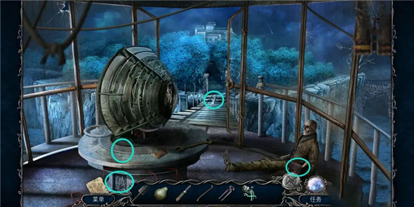 2、到灯塔大门前拿走门下面的「雕像头」,再点击左边的玻璃瓶达成1/22成就【侦探】。接着回到别墅门口拿走门旁边挂着的「皮筋」,然后和右边的树干、雕像头组合成弹弓撞破铁门,最后点击草坪上的雕像达成2/22成就【侦探】。
