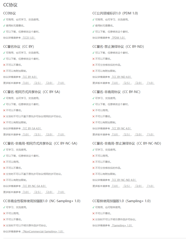 网站部分栏目标注了(cc协议),栏目下的素材囊括了CC协议、GNU通用公共许可协议、GNU较宽松通用公共许可协议等多种协议。