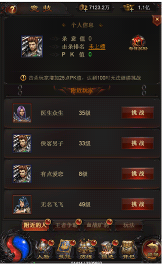 b. 对手的实力有强有弱,玩家可以选择攻击该玩家,成功战胜可以获得金币,装备,经验奖励。挑战失败不获得奖励。