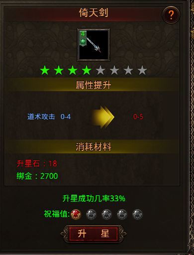 在锻造界面,花费绑金可为装备进行升星,升星可增加装备攻击属性