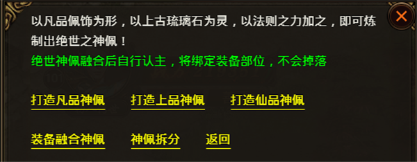归元一气炉可以打造绝世神饰,神佩可以和穿戴的佩饰进行融合,融合后会将神级属性转移到对应部位上