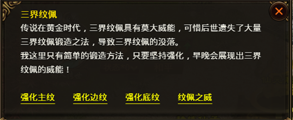 一、三界纹佩使用纹佩精华可以在铁匠旁三界纹佩处对纹佩进行升级,纹佩可以通过打boss和密令试炼中获得