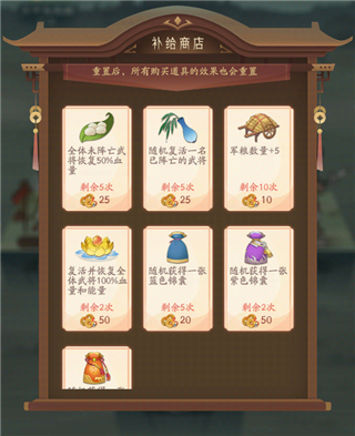 这里的军粮和铜币都是过关斩将的独有道具,并且会随着过关斩将的刷新而自动重置,因此大家不用担心某次军粮或者铜币用多了,下次就不够的问题。所以个人建议在保障抵达终点的前提下,可以用多余的铜币购买锦囊、提高队伍的战斗力。当然补给商店的商品也和军粮、铜币一样,会在刷新时自动重置。